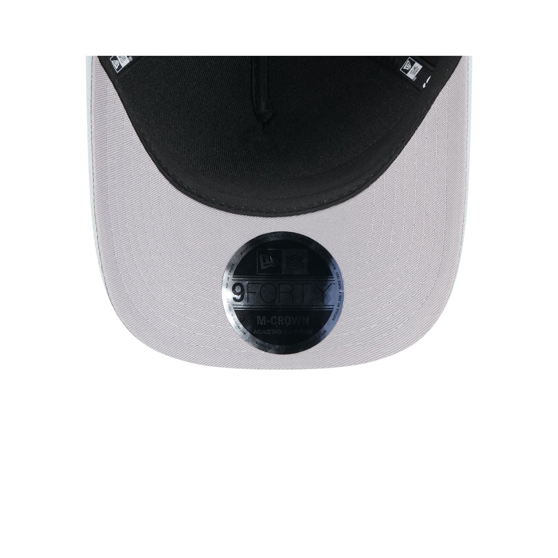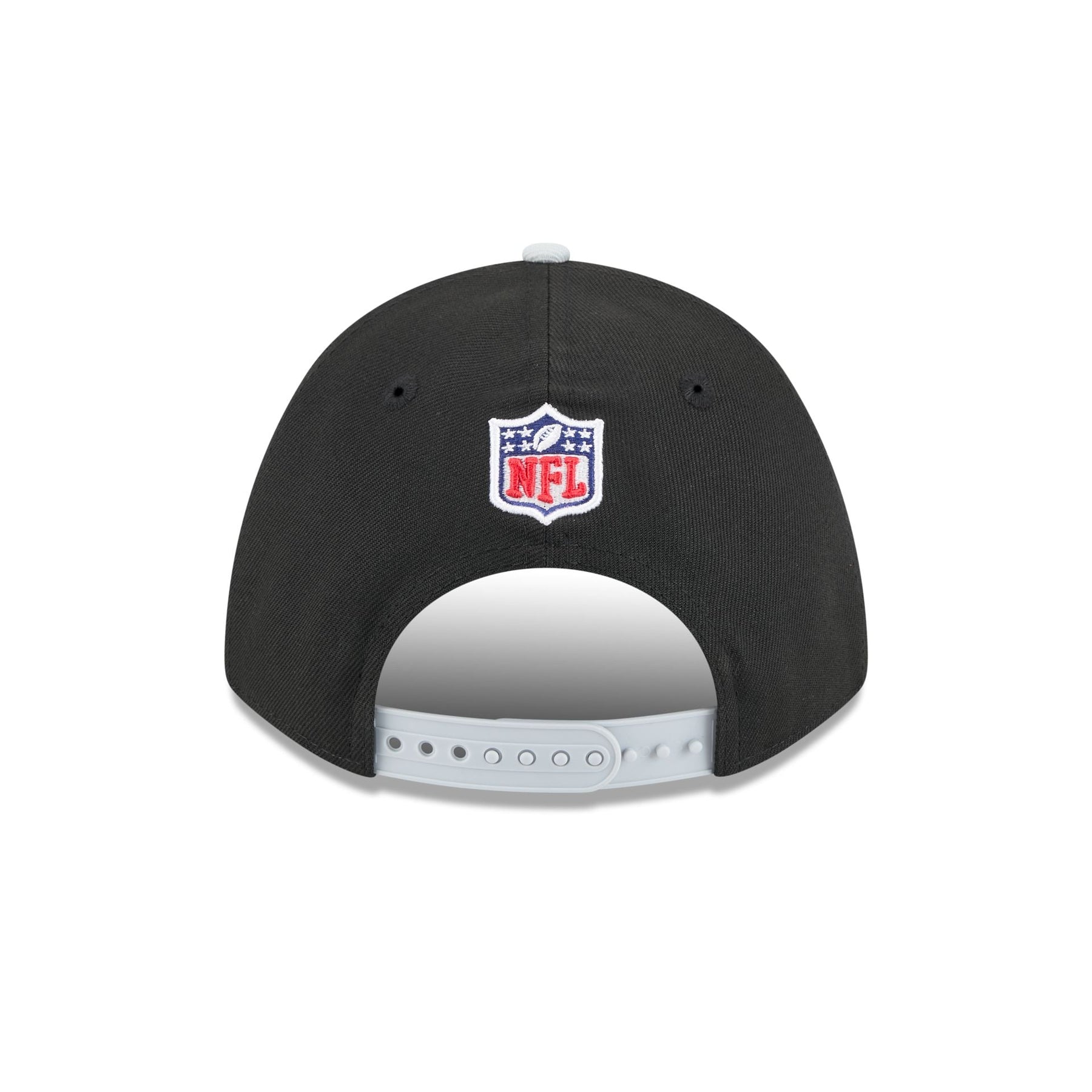 The Las Vegas Raiders 2025 Draft 9FORTY M-Crown A-Frame Snapback features an embroidered Raiders logo and wordmark at the front panels with an NFL Shield logo above a snapback closure at the rear. Additional details include ornamental stitched details at the visor and a gray undervisor.