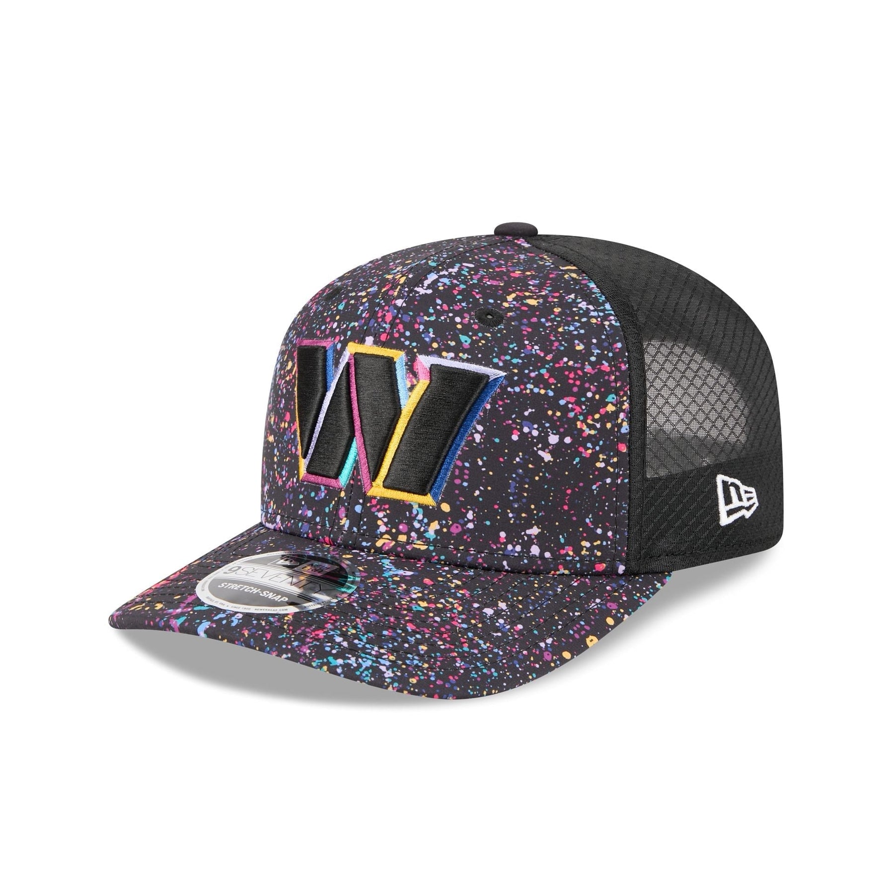 The Washington Commanders 2025 Crucial Catch 9SEVENTY Trucker features an embroidered Commanders logo at the front paint splatter panels with a woven NFL Shield tag above a snapback closure at the rear. Additional details include a Crucial Catch Intercept Cancer patch at the right-wear side with performance mesh rear panels and a black undervisor.